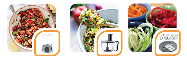 مخلوط کن، تیغهی خردکن وخمیرزن ، آب مرکبات گیری، صفحات رنده ریزر و درشت و چیپسی نازک و ضخیم و خلالی